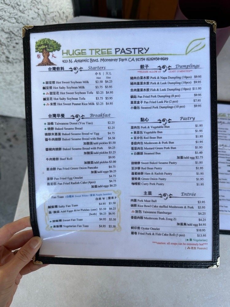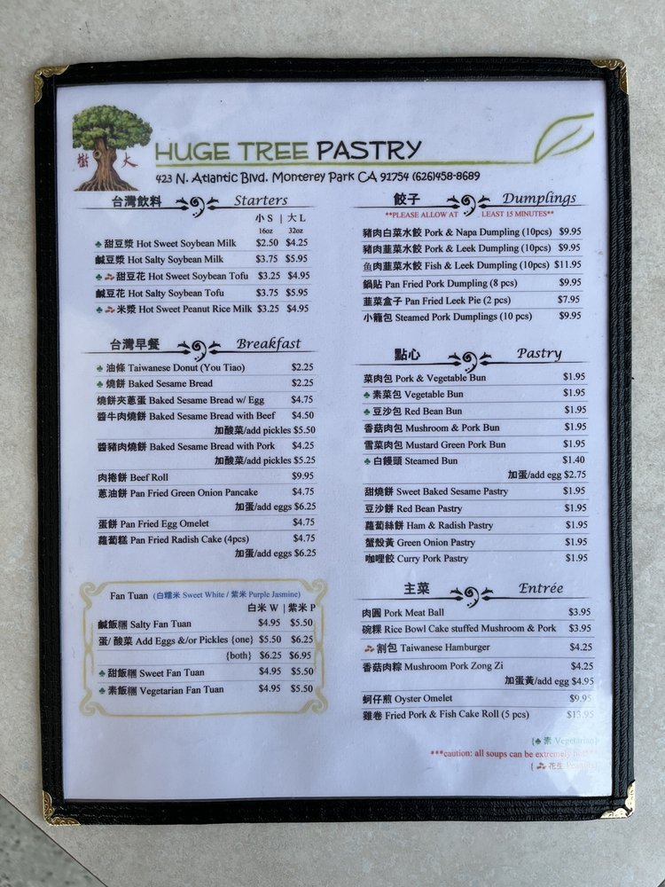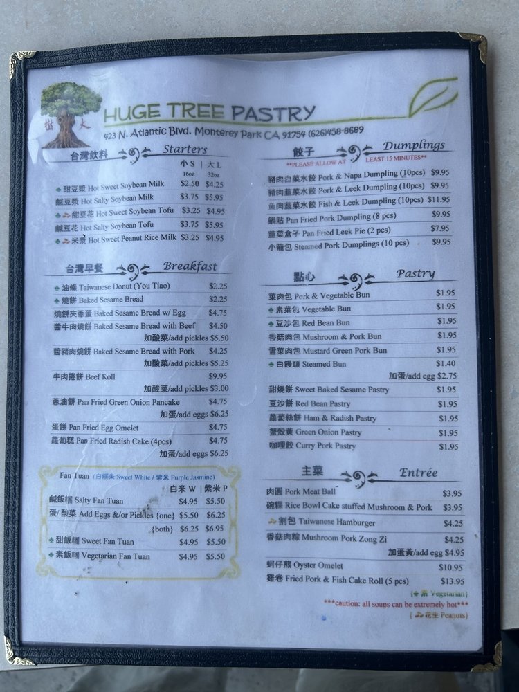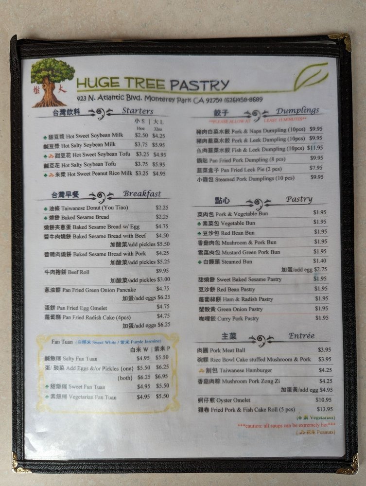 Introducing the menu at Huge Tree Pastry, a Taiwanese breakfast and brunch spot in Monterey Park, CA. Known for their delectable purple rice fan tuan, this cozy eatery offers takeout options and vegan choices. Customers rave about the authentic Taiwanese flavors, with favorites including the egg omelette pancake, sesame bread with scallion egg, and sweet iced soy milk. Despite some mixed reviews on the rice being dry at times, the overall consensus is positive, with many praising the traditional dishes and friendly service. With limited seating available due to the pandemic, it's recommended to order ahead for a quick and satisfying meal on the go. So, if you're craving a taste of Taiwan in LA, Huge Tree Pastry might just be your new go-to spot.